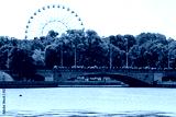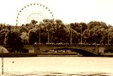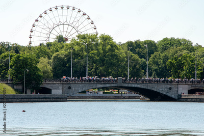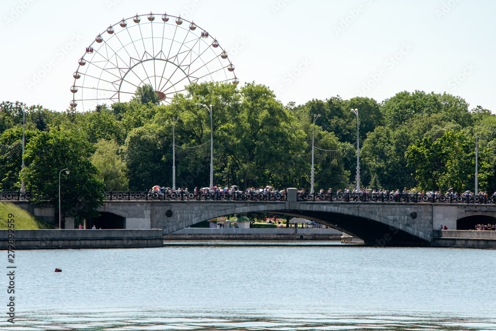 Embankment of the river Svisloch, the procession of the column of people across the bridge, the Ferris wheel