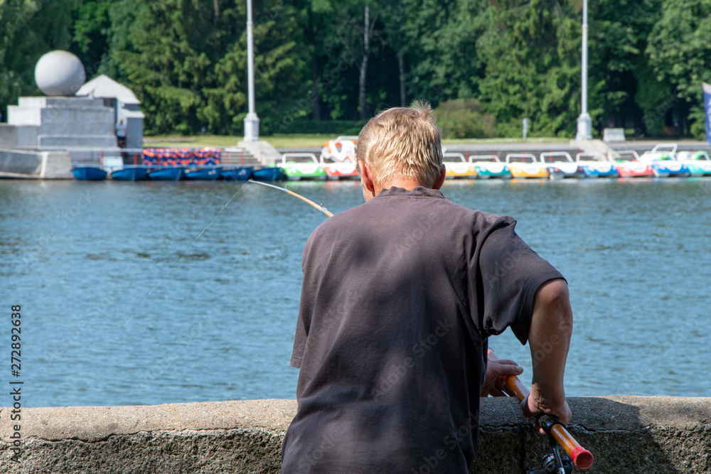 Fisherman fishing in the city channel, holding an old fishing rod in his hand