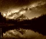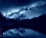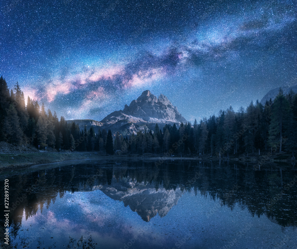 Milky Way over Antorno lake at night. Summer landscape with alpine mountains, trees, blue sky with milky way and stars, beautiful reflection in water, high rocks. Dolomites, Italy. Space and nature