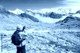 Back view of photographer taken pictures of Mt.Everest and Himalayas mountain range on the way to Renjo La pass (5,345 m) in Khumbu region of Nepal.