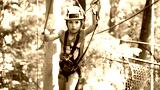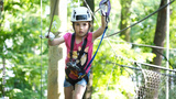 Cute preschool girl in climbing gear in a rope park, family outdoor activities, happy summer time, sports and an active lifestyle