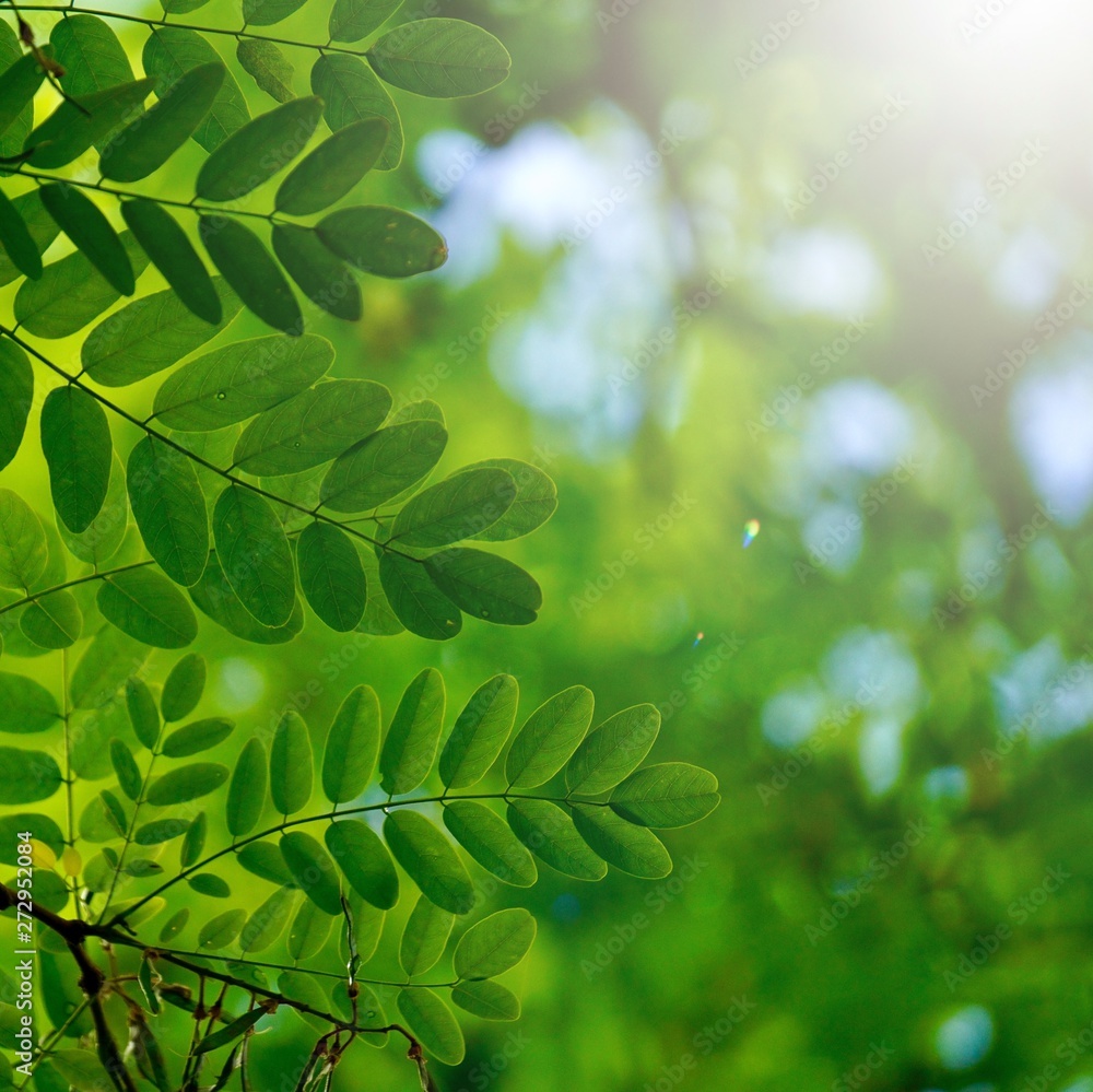 green tree leaves and branches in the nature in summer, green background