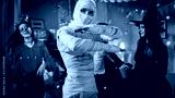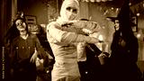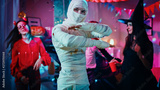 Halloween Costume Party: Old Skinny and Bandaged Mummy Dances. In the Background Zombie, Death, Witch and She Devil Have Fun in a Monster Party Decorated Room