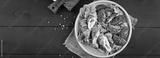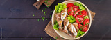 Delicious chicken rolls stuffed with cheese and spinach wrapped in strips of bacon. Top view. Banner