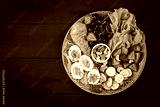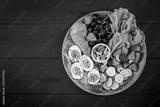 Plate with a paleo diet food. Boiled eggs, avocado, cucumber, nuts, cherry and strawberries. Paleo breakfast. Top view