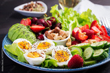 Plate with a paleo diet food. Boiled eggs, avocado, cucumber, nuts, cherry and strawberries. Paleo breakfast.