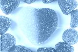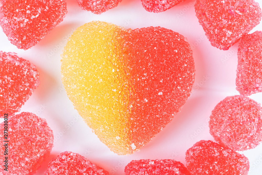 Red jelly sweets around a large red-yellow heart-shaped candy close-up on a light background. The concept of bright sweets, harmful delicacy.