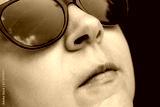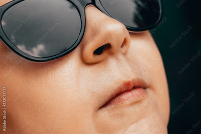 Young woman with clean complexion and thin lips looking up – Blue sky with white clouds reflecting in a pretty girl’s black sunglasses