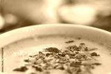 Yellow chicken soup with cream and parsley leaves garnish in a white bowl– Traditional recipe for a delicious and nutritious meal with meat and vegetables