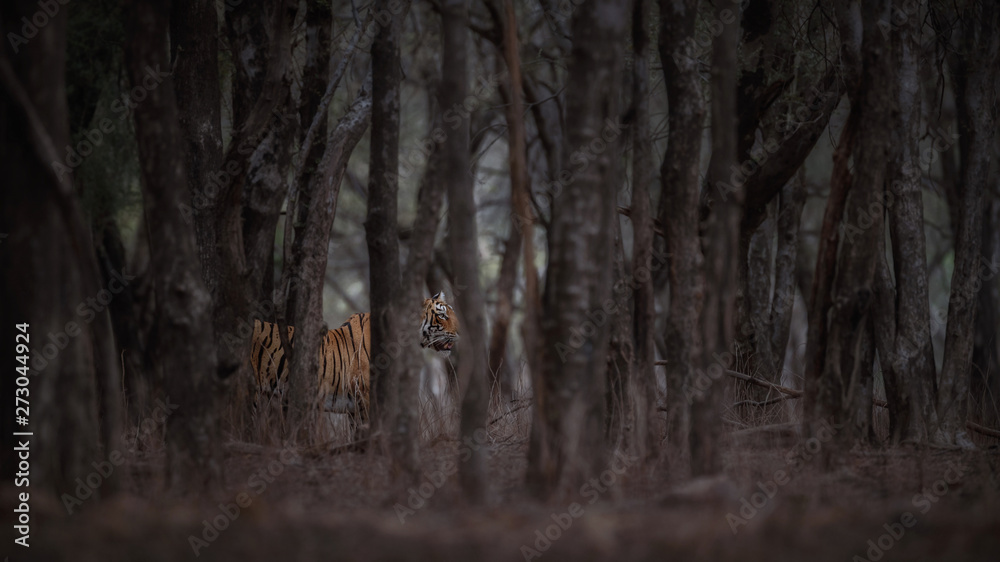 Beautiful tiger in the nature habitat. Mighty tiger walk during the golden light time. Wildlife scene with danger animal. Hot summer in India. Dry area with royal bengal tiger, Panthera tigris tigris