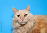Portrait of a long haired orange tabby cat looking directly at viewer with bright green speckled eyes. Blue background.