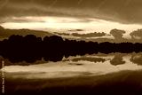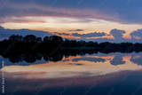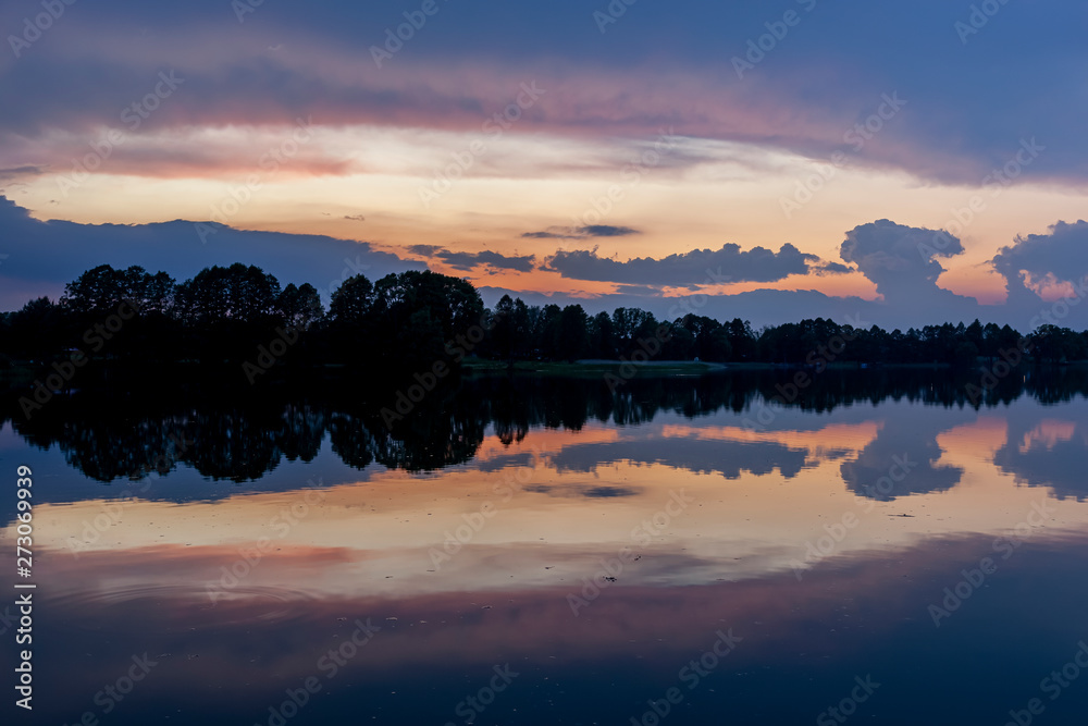Zachód słońca nad jeziorem Kalwa w Polsce. Odbicie nieba w wodzie.