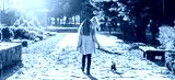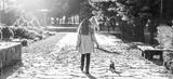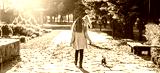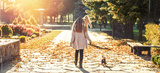 Blond girl walking with cute puppy on the sunshine autumn park alley