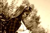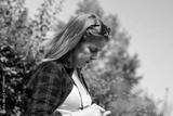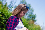 Young sad woman with short brown hair wearing plaid shirt looking down at her hands on a sunny day – Casually dressed millennial feeling depressed in nature