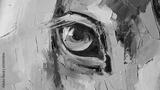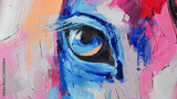 Oil horse portrait painting in multicolored tones. Conceptual abstract painting of a horse head. Closeup of a painting by oil and palette knife on canvas.
