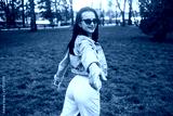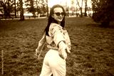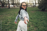 Beautiful Brunette Girl in Sunglasses White Pants and Jeans Jacket, Red Lipstick