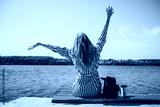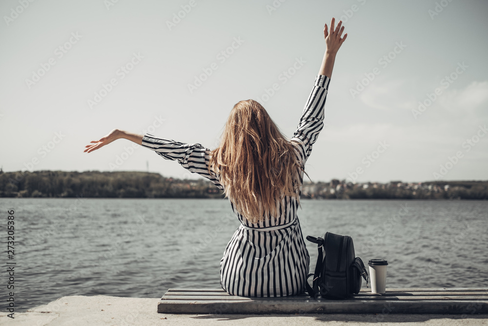 Outdoor Summer Portrait of Young Beautiful Girl in White Striped Stylish Dress Against the Lake