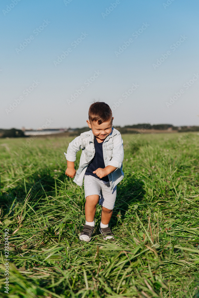 Happy little boy jumping on grass in summer day