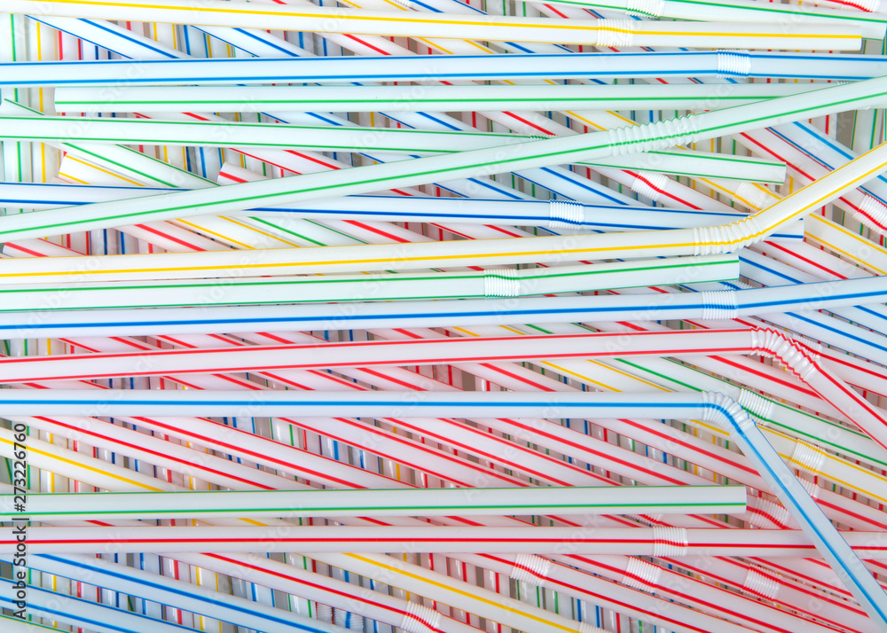 Top view flat lay of colorful striped plastic straws. California just became the first US state to ban plastic straws in restaurants, unless customers ask for one.