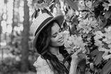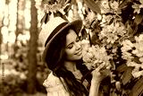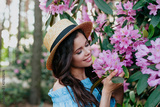 Close up romantic portrait of beautiful elegant woman in straw hat in blossom spring trees.