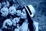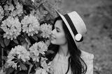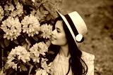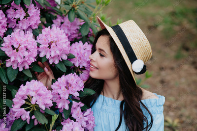 Beautiful young woman with long brunette hair in straw hat posing near pink flowers in a garden