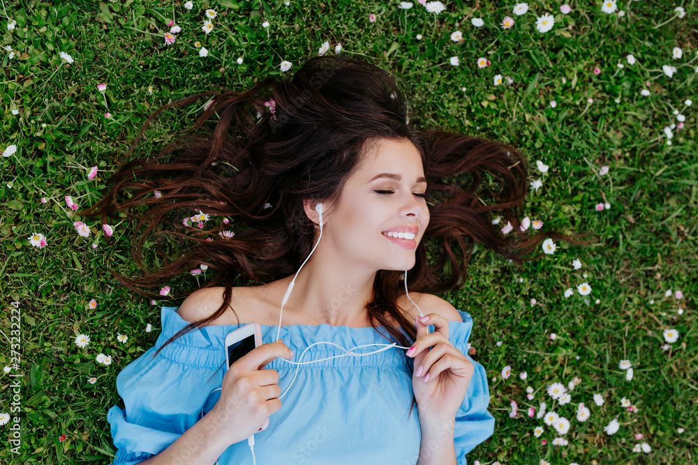 Beautiful woman listening to music with headphones and lying in a garden of flowers