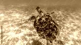 Sea turtle swims in sea water, Olive green sea turtle closeup. Wildlife of tropical coral reef, Aquatic animal underwater photo.