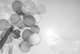 Hand holding multi colored balloons done with a retro vintage instagram filter effect.