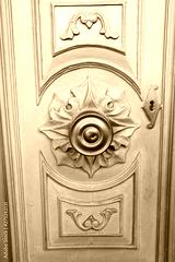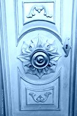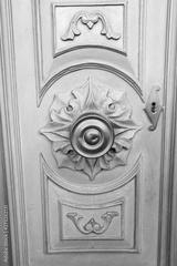 old wooden door with round door handle and wood carving, Valletta, Malta