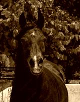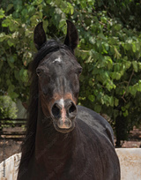front view of a dark bay purebred Arabian horse mare looking straight at the camera with green trees in the background