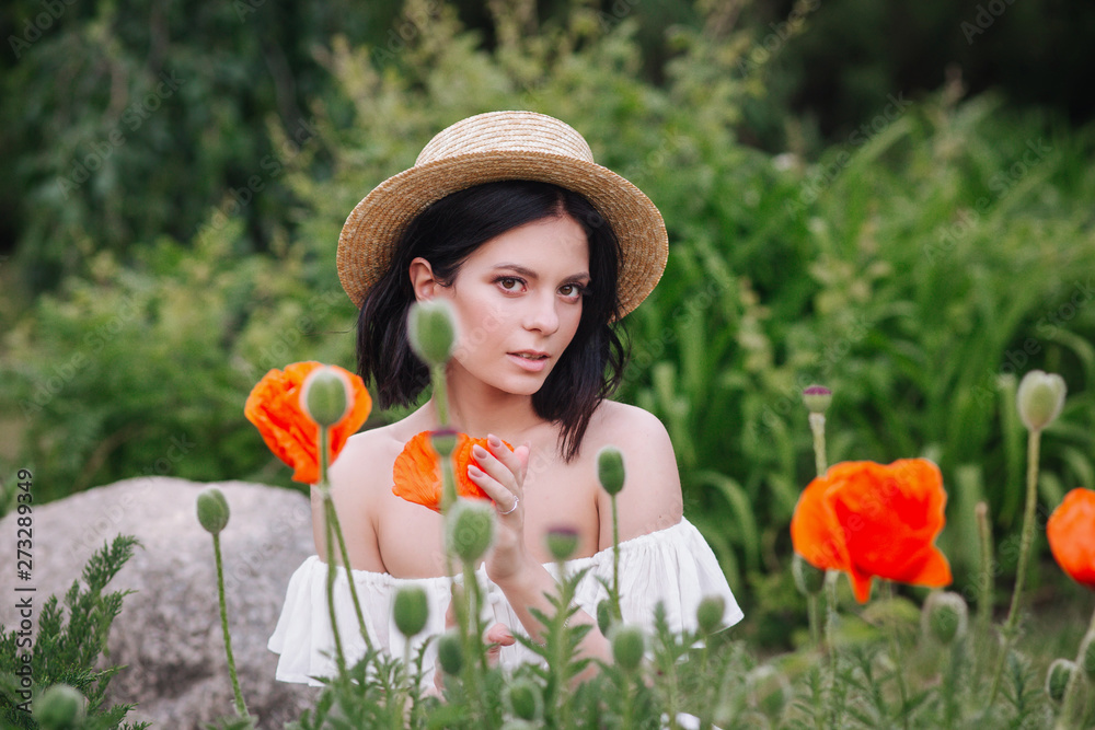 Romantic brunette woman in straw hat with flower in hand sitting in amazing poppy field.