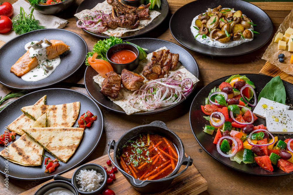 Assorted foodset on table. Kebab of pork, salmon grill, borscht, greek salad, rack of labm, fried potatoes with mushrooms.