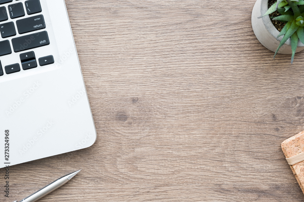 Wood office desk table with laptop computer, pen and supplies. Top view with copy space, flat lay.