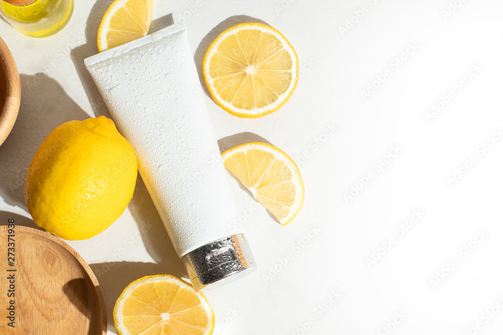 cosmetic lotion cream facial foam medical skin care product package tube mockup, lemon fruit vegetable wet waterdrop, table background, organic food and nutrition vitamin citrus