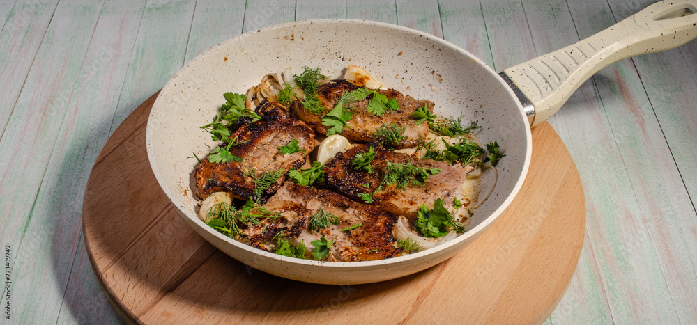 Bacon fried with onions and herbs in a pan of light color on a cutting Board and light background