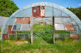 Front view of an old greenhouse on a sunny day.