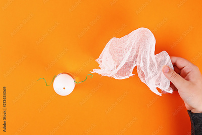 Diy Halloween ghost of starch and gauze orange background. Gift idea, decor Halloween. Step by step