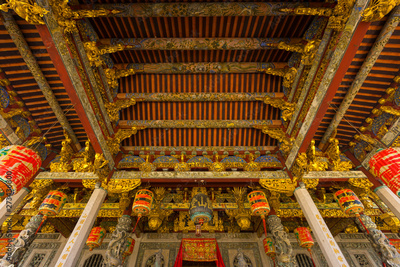 Exterior view of Leong San Tong Khoo Kongsi clanhouse against blue sky in Penang, Malaysia