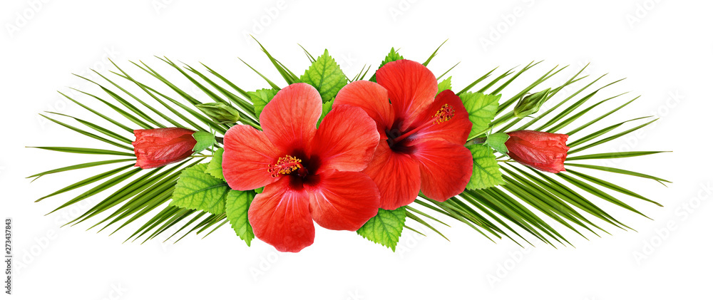 Palm leaves and red hibiscus flowers in a line arrangement