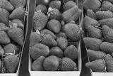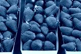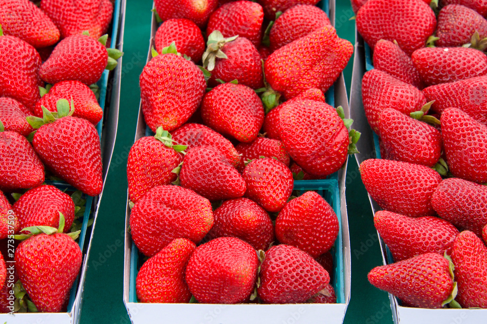 Baskets of fresh ripe strawberries for sale at Farmers Market. The fruit is widely appreciated for its characteristic aroma, bright red color, juicy texture, and sweetness.