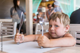 A little boy holds a knife and fork and waits for food. A hungry child is sitting at a table in a summer restaurant waiting for meals.