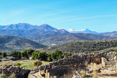 Mighty ruins of ancient and well-built Mycenae rich in gold - home of the mythical Agamemnon synonymous with the names Homer and Schliemann with mountains of the Peloponnese covered with olives