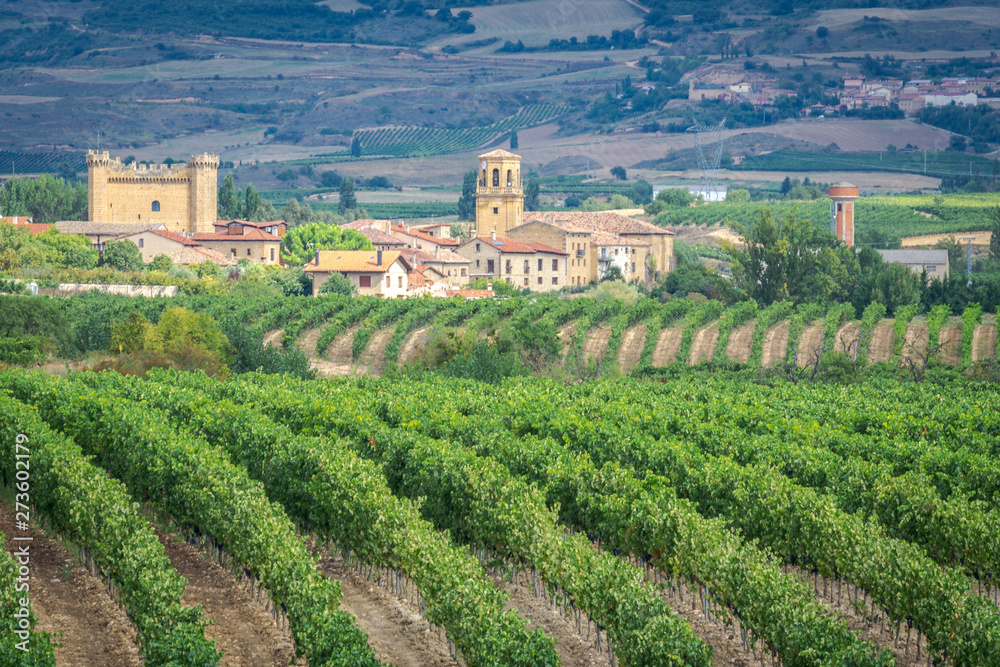 Vineyards with Sajazarra village as background, La Rioja, Spain