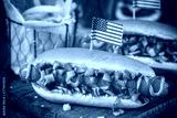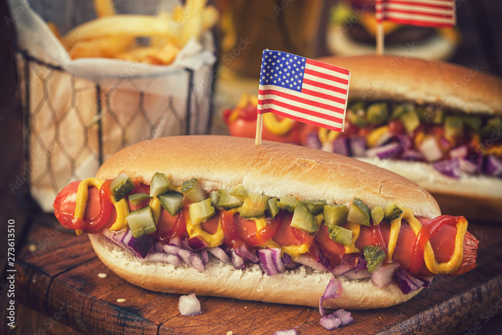 American hot dog with pickles,onions, ketchup, mustard and french fries at a picnic for fourth of July