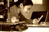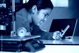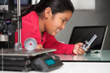A smiling young girl is happy to see her 3d printed model and is holding it in her hand with a 3d printer in foreground and touchscreen in background.