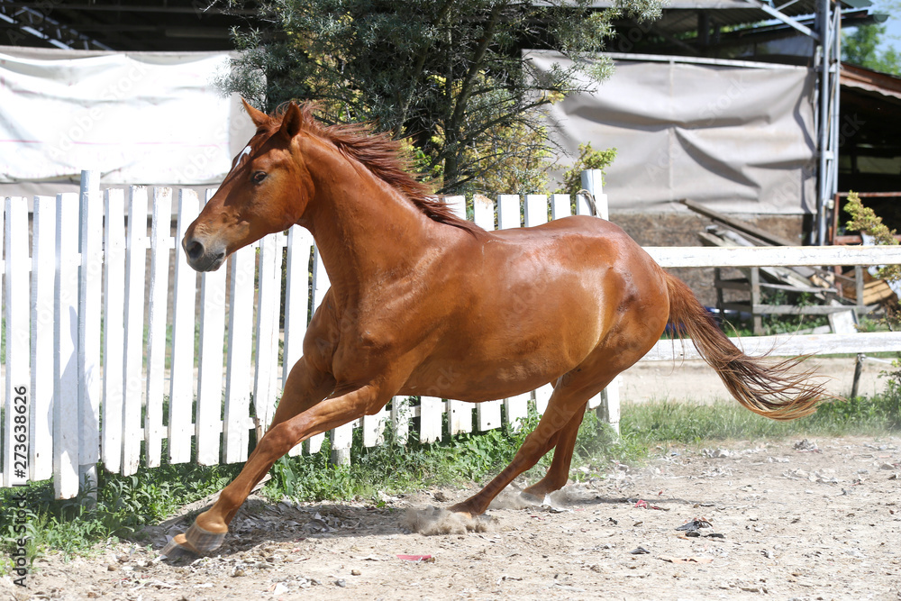 Beautiful young chestnut colored horse galloping in the corral summertime