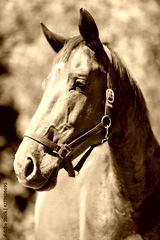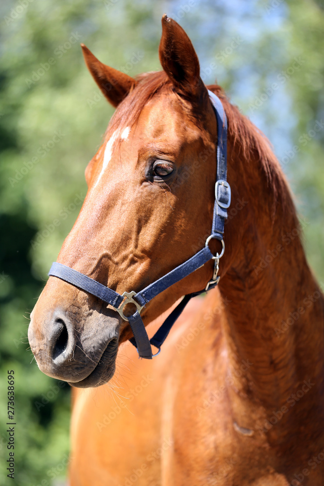 Head of a beautiful young sport horse in the corral summertime outdoors