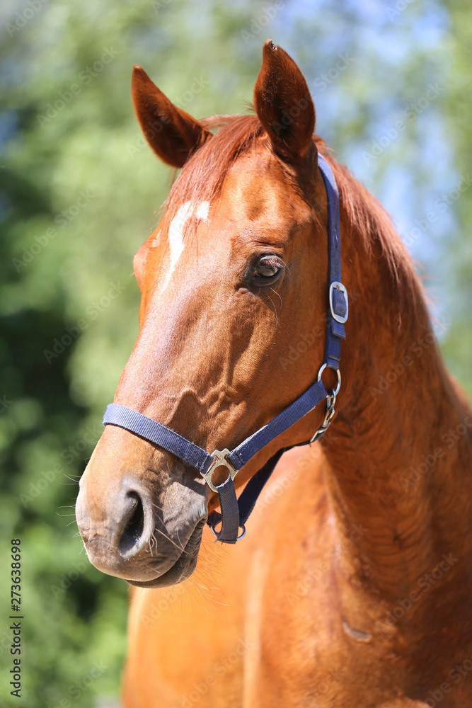 Head of a beautiful young sport horse in the corral summertime outdoors