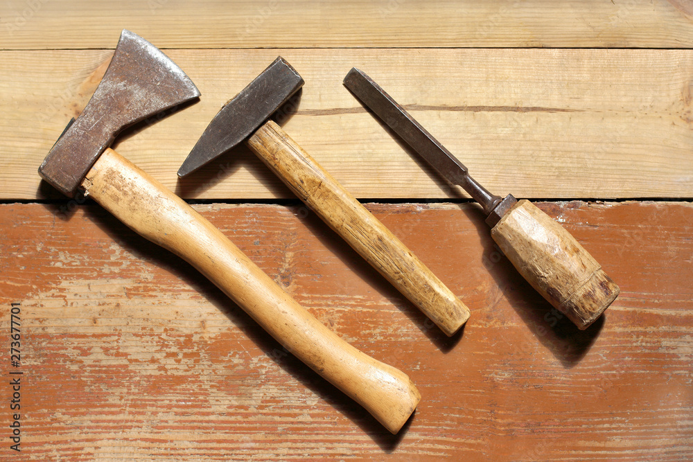 Old checked tool on the renovated wooden floor Top view. carpenter craft