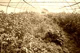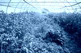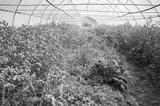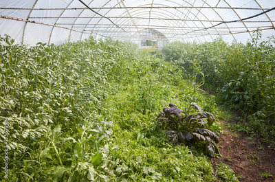 Interior of a greenhouse with organic vegetables during water spraying.